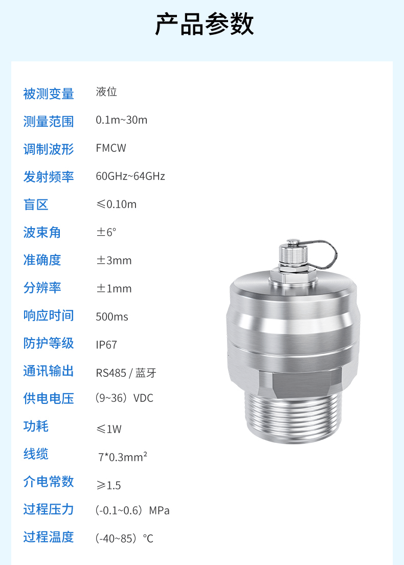 聯測儀表WSR300雷達液位計檢測距離遠,波束能量低,可安裝于各種金屬、非金 屬容器或管道內。適用于粉塵、水霧、有惰性氣體及蒸汽存在的場合。 雷達液位計對人體及環境均無傷害,還具有不受介質比重的影響、不受 介電常數變化的影響、不需要現場校調等優點。