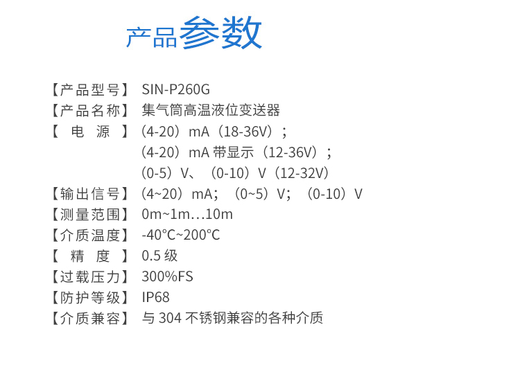 聯測儀表SIN-P260G殼體高溫型集氣筒式液位計用于測量較高溫度液體介質的液位,原理是被測液體介質壓縮集氣桶內的空氣,空氣壓力通過毛細管傳遞給敏感元件,敏感元件本身不與被測介質直接接觸,因此變送器可以應用在較高溫度的介質環境中,同時,內置微型信號放大處理電路,可以直接與計算機接口卡、控制儀表、智能儀表或 PLC 等連接,進行遠程傳輸。液位變送器廣泛應用于環保、水利、供水、工業過程控制、變頻供水等較高溫度介質的液位測量。