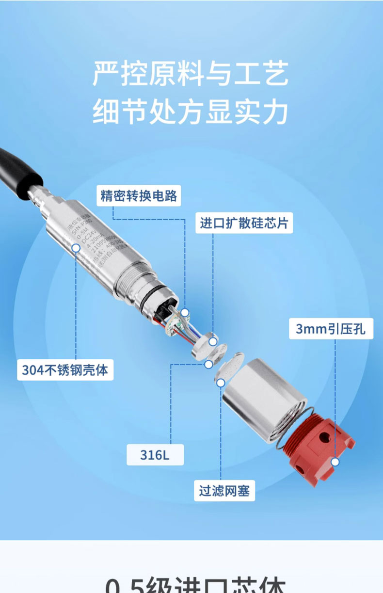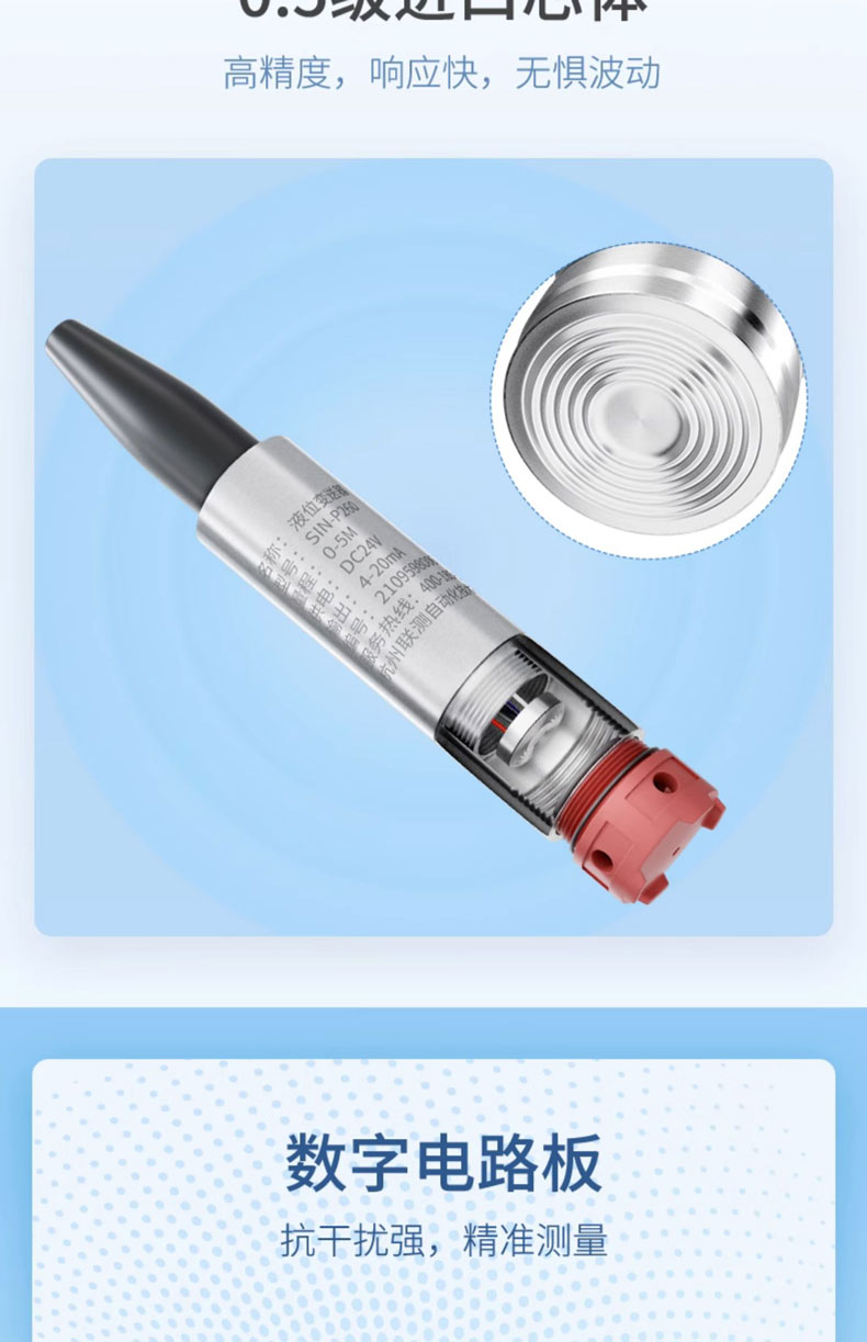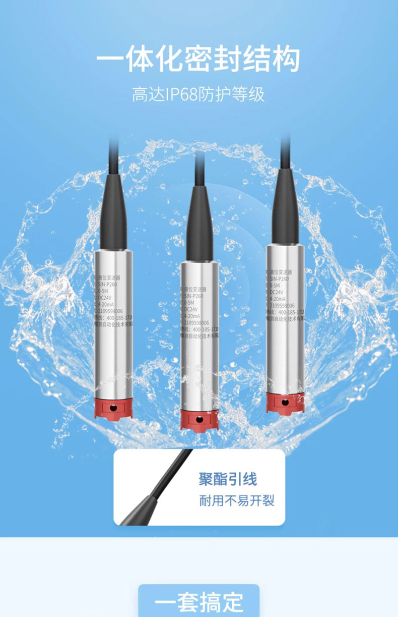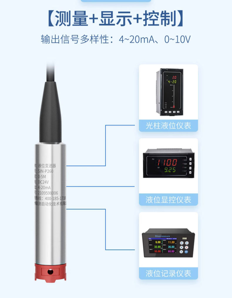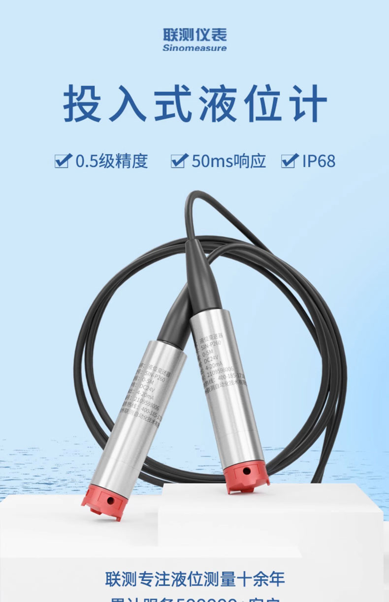 聯(lián)測(cè)儀表SIN-P260S新款投入式液位計(jì)由高性能擴(kuò)散硅壓阻式壓力傳感器作為測(cè)量元件,把與液位深度成正比的液體靜壓力準(zhǔn)確測(cè)量出來,并經(jīng)過信號(hào)調(diào)理電路轉(zhuǎn)換成標(biāo)準(zhǔn)(電流或電壓)信號(hào)輸出,建立起輸出信號(hào)與液體深度的線性對(duì)應(yīng)關(guān)系,實(shí)現(xiàn)對(duì)液體深度的測(cè)量。產(chǎn)品精度高、體積小,直接投入液體中,即可測(cè)量出變送器末端到液面的液體高度,使用方便。適用于石油、化工、 電廠、城市供水、水文勘探領(lǐng)域的液位測(cè)量與控制。